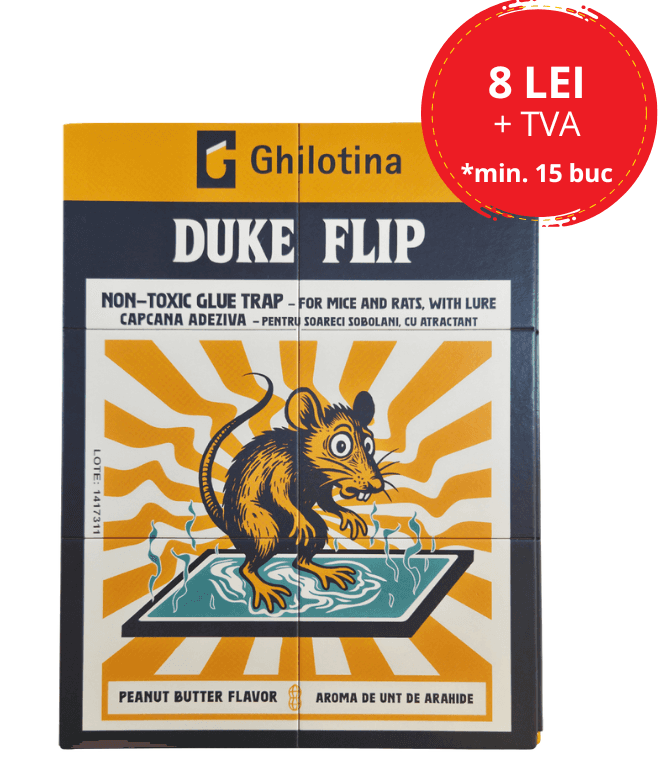 Duke Flip este o capcană adezivă din carton gros, cu un adeziv special, foarte puternic. Datorită designului său pliabil, capcana poate fi așezată în diferite forme (plat, U, cutie), ceea ce o face ușor de adaptat la orice spațiu, inclusiv în locuri mai greu accesibile.